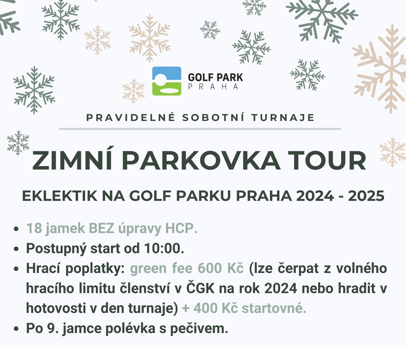 rádi bychom vás informovali o zahájenà Eklektik Zimnà Tour na Golf Parku Praha, která bude probÃhat pravidelnÄ› v sobotu na GPP. Jedná se o sérii 18 jamkových turnajů, kde na na jednotlivých turnajÃch se bude hrát na stablefordové body ve dvou HCP kategoriÃch +9-25 a 25,1-54 bez úpravy HCP.